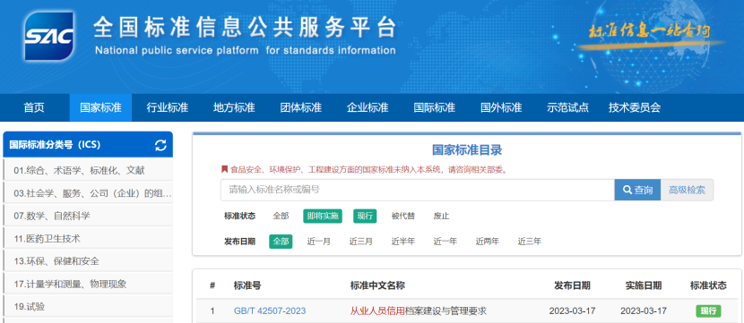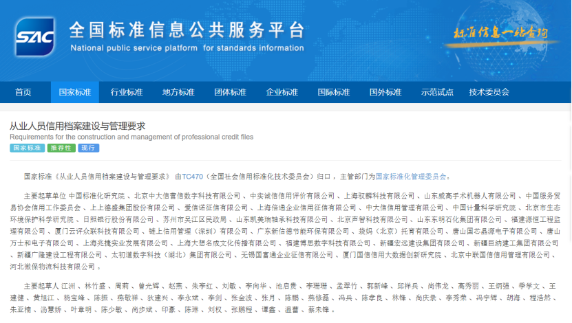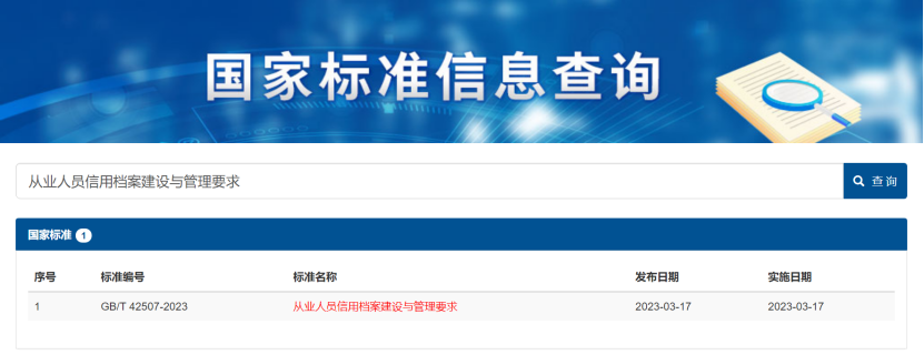 由中国服务贸易协会信用工作委员会牵头起草的《从业人员信用档案建设与管理要求》(国家标准编号:GB/T 42507-2023)正式发布,自2023年3月17日起实施。