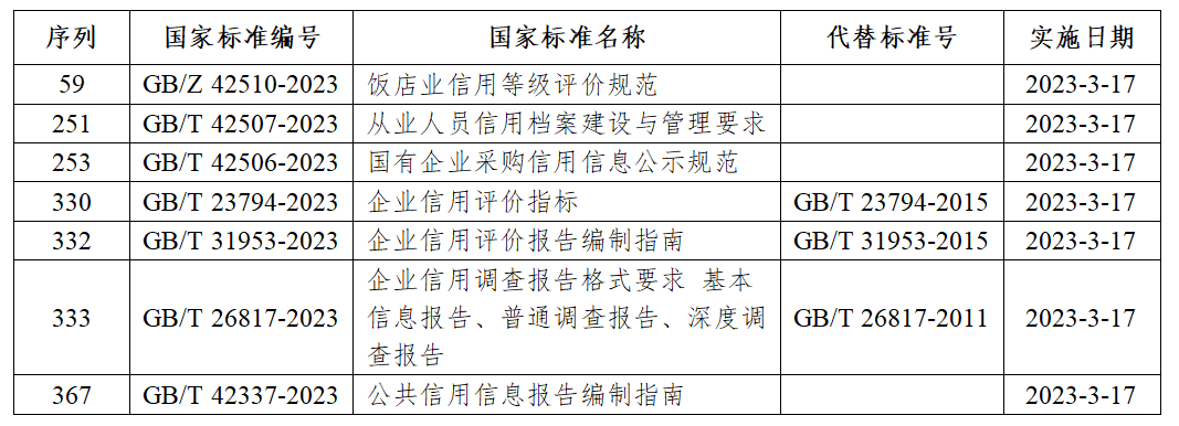 同期还发布了《饭店业信用等级评价规范》、《国有企业采购信用信息公示规范》、《企业信用评价指标》、《企业信用评价报告编制指南》、《企业信用调查报告格式要求 基本信息报告、普通调查报告、深度调查报告》、《公共信用信息报告编制指南》六项国家标准。